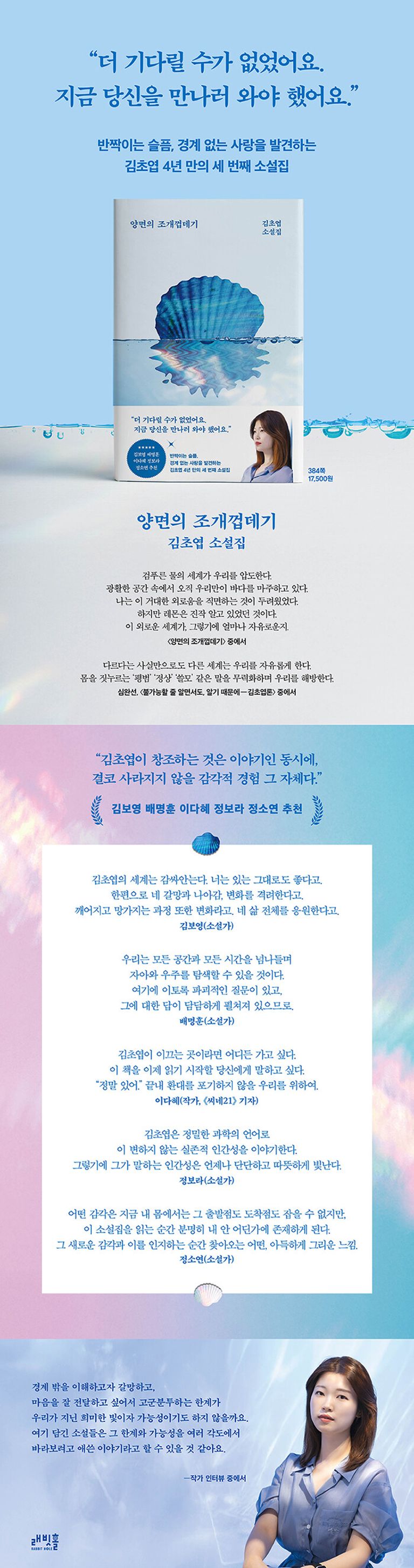 검푸른 물의 세계가 우리를 압도한다. 광활한 공간 속에서 오직 우리만이 바다를 마주하고 있다. 나는 이 거대한 외로움을 직면하는 것이 두려웠었다. 하지만 레몬은 진작 알고 있었던 것이다. 이 외로운 세계가, 그렇기에 얼마나 자유로운지. (〈양면의 조개껍데기〉)