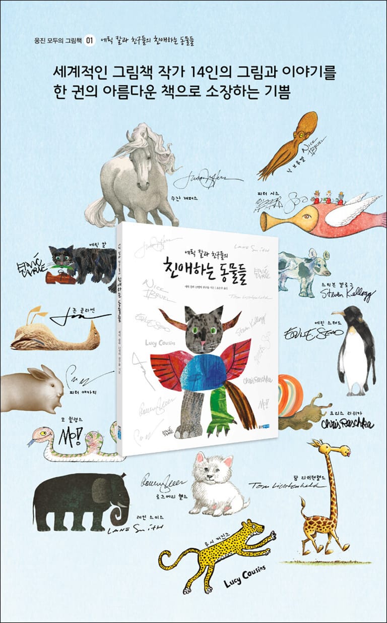 웅진 모두의 그림책 1권. 세계적인 그림책 작가 14인이 선보이는 14가지 동물 이야기다. ‘가장 좋아하는 동물은 무엇입니까?’라는 한 가지 질문에서 탄생한 14가지 답변이다. 응답한 14인의 그림책 작가 개개인의 작품 세계만큼이나 다채로운 이미지와 이야기가 펼쳐진다. 약 25개 국어로 번역 출간된 베스트셀러 그림책 <배고픈 애벌레>, <갈색 곰아, 갈색 곰아, 무엇을 보고 있니?>의 작가 에릭 칼은 자신이 가장 좋아하는 동물로 반려 고양이 피피를 꼽으면서, 피피에 얽힌 추억을 데려온다.