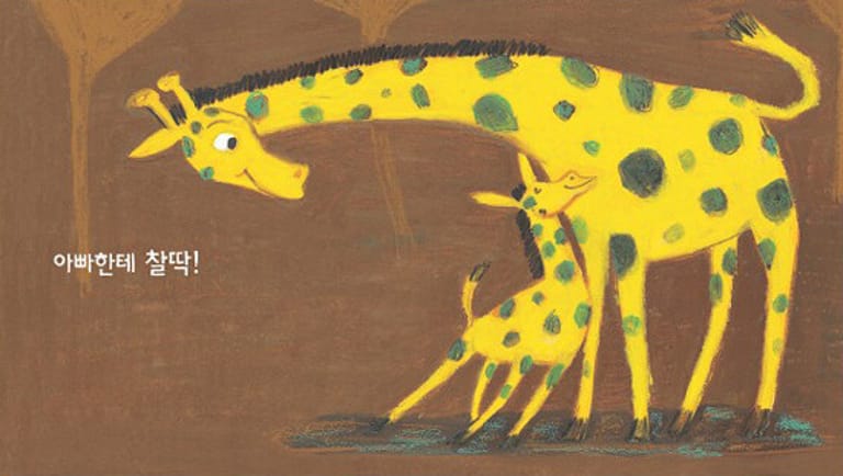 아기 악어는 서툰 솜씨로 찰바닥 동동 헤엄쳐서, 아기 기린은 긴 다리로 겅중겅중 달려서, 개구쟁이 아기 호랑이는 아빠에게 들킬세라 살곰살곰 다가가서, 자석처럼 혹은 찰엿처럼 찰딱, 찰딱, 찰딱 아빠에게 달라붙는다.
