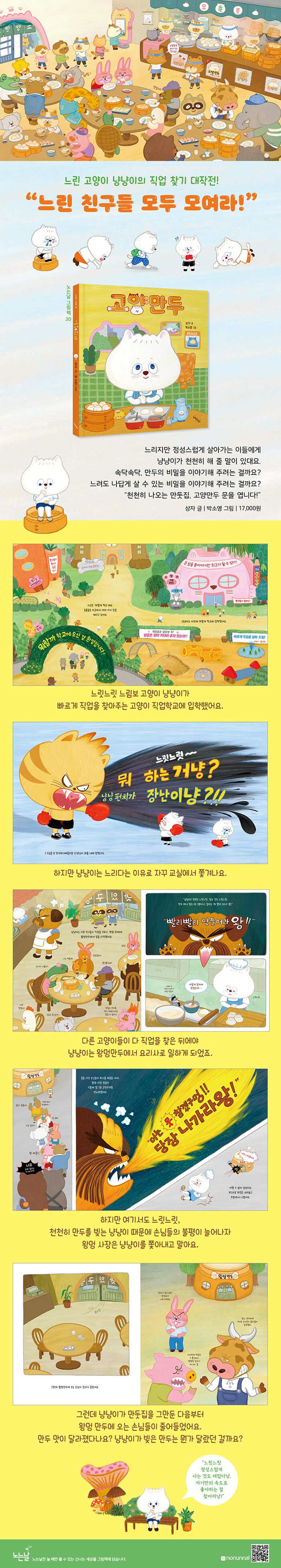 느리지만 정성스럽게 살아가는 이들에게 냥냥이가 천천히 해 줄 말이 있대요. 속닥속닥, 만두의 비밀을 이야기해 주려는 걸까요? 느려도 나답게 살 수 있는 비법을 이야기해 주려는 걸까요?