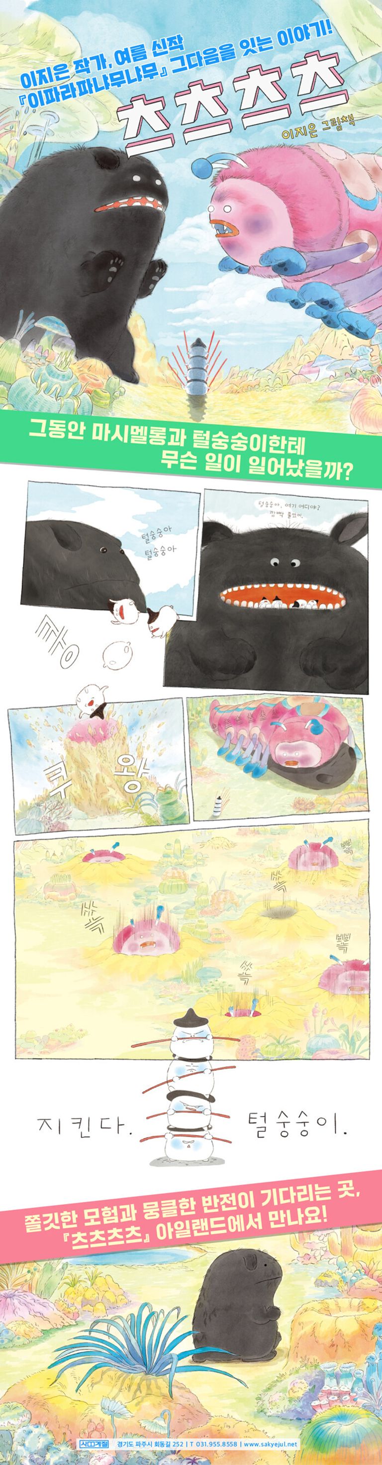 작고 말랑해서 늘 먹힐까 봐 오해하는 마시멜롱, 둔하고 해맑아서 더 유머러스한 털숭숭이, 그리고 이번 작품의 시크릿 캐릭터 츠츠츠츠. 이들이 만들어 낸 흥미진진한 이야기가 더 과감하고 더 화려해진 그림에 담겼습니다. 이지은 작가가 『이파라파냐무냐무』 때부터 촘촘하게 구축해 온 판타지의 세계는 이번 작품에서 더 입체적이고 선명하게 공간을 드러냅니다. 올여름, 이 반가운 친구들과 함께 츠츠츠츠 아일랜드로 모험을 떠나 보세요.